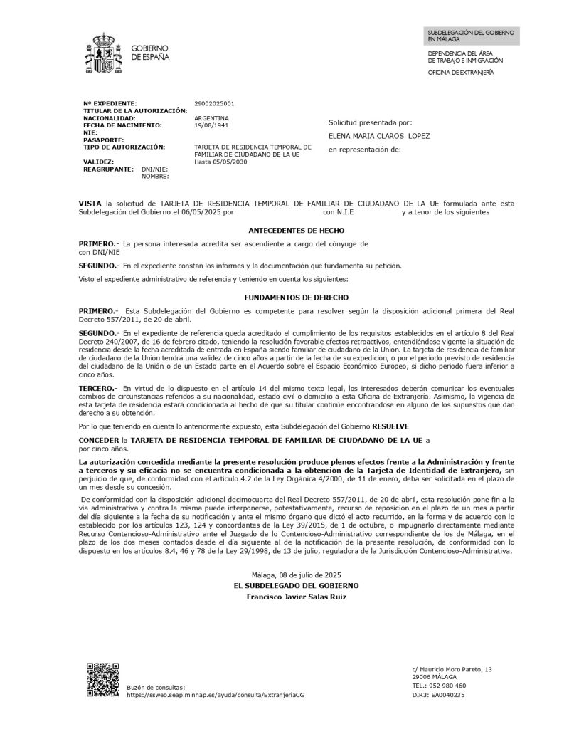 ๐Ÿ“ŒSe solicitรณ TARJETA DE RESIDENCIA DE FAMILIAR DE CIUDADANO DE LA UE formulada ante la Subdelegaciรณn del Gobierno de Mรกlaga el 6/05/2025 por nuestra clienta de ARGENTINA. La interesada acredita ser suegra de un ciudadano de la Uniรณn Europea .En el expediente constan los informes y la documentaciรณn que fundamenta su peticiรณn.